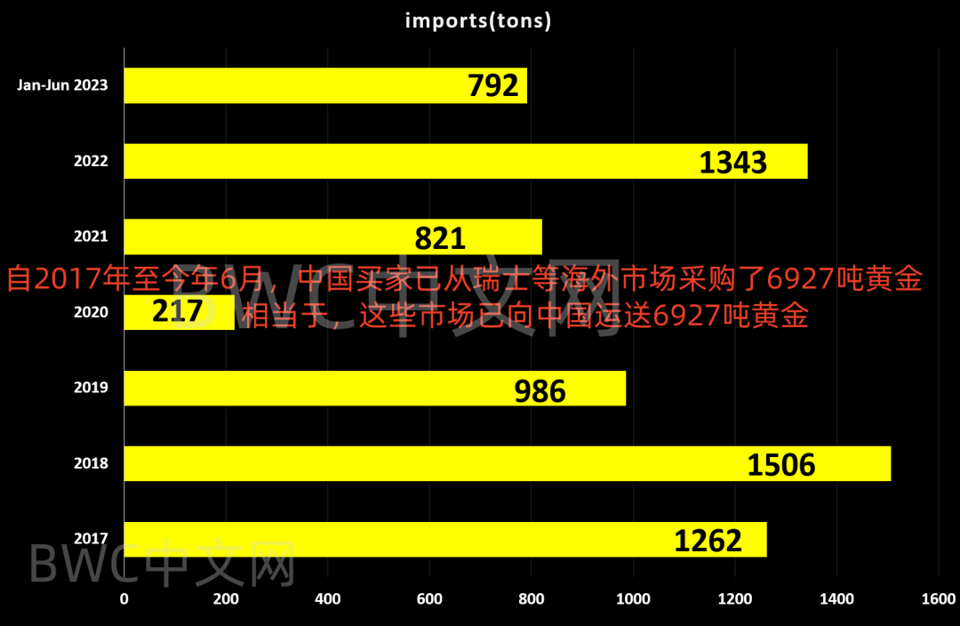 而根据下图,可以看到,自2017年至今年6月,中国买家已从瑞士等海外市场采购了6927吨黄金,也就是说,从进口的角度,过去6年以来,瑞士等欧美市场已向中国运送了约6927吨黄金。