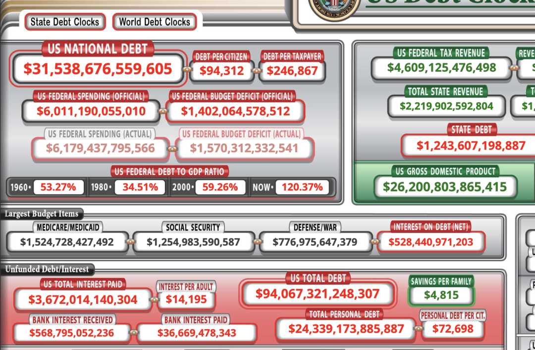 2月6日,在一个像飞机仪表盘一样的显示器上显示联邦债务总额已经突破31.5万亿关口,这个数据也会同步显示在美国纽约市西43街上竖立着的一个美国国债实时时钟上面,提醒着过往行人们美国永远不可能会还清所有的债务,如果你在那里停留几分钟,就会增长几万美元。