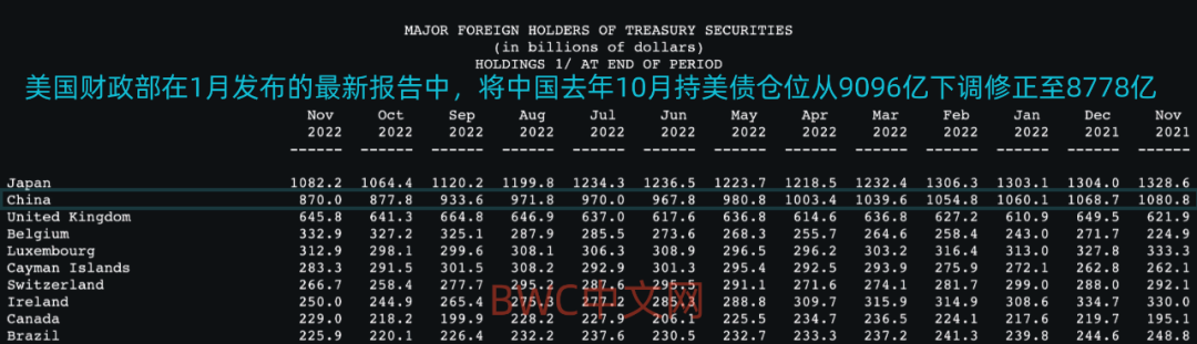 比如,在此期间,作为美国最大债主的日本就已经净抛售了高达2460亿美元的美债,在全球央行中抛售力度最大,截至去年11月,日本所持美债仓位已经大幅降至三年以来的最低水平至一点零七八万亿美元。