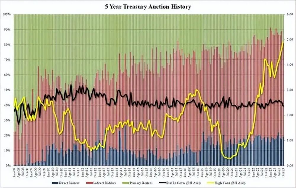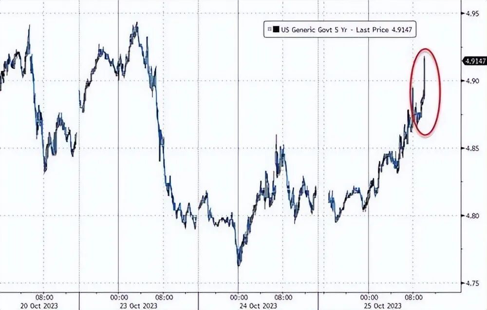 内部情况甚至更糟糕,间接交易从71.2%下滑近10 个基点至 61.5%,这是自去年9月以来的最低水平,并且低于最近68.9%的平均水平。5年期美国国债拍卖的结果如此糟糕,引发美债市场巨震。紧接着,被称为全球资产定价之锚的10年期美债收益率跳升至高达4.96%,并迅速逼近5.00%的关键水平,逆转了本周稍早前该收益率回落的现象。
