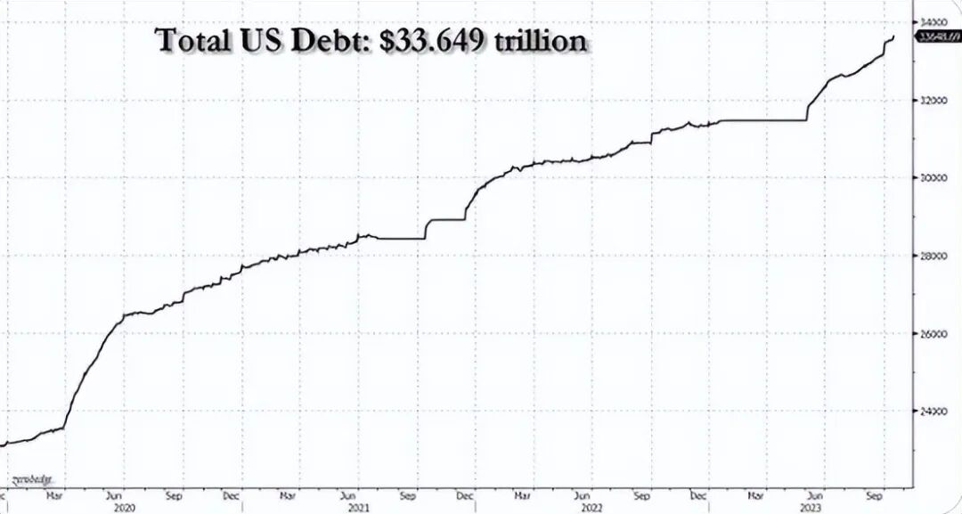 而下面这张图表显示,今年6-8月美国债务在短短三个月内增加1 万亿美元后,随着美债以指数级速度增长,美债总额在9月短短一个月内激增了6000多亿美元,这一激增幅度往往只有美国经济大萧条等极度危机时期才会出现。