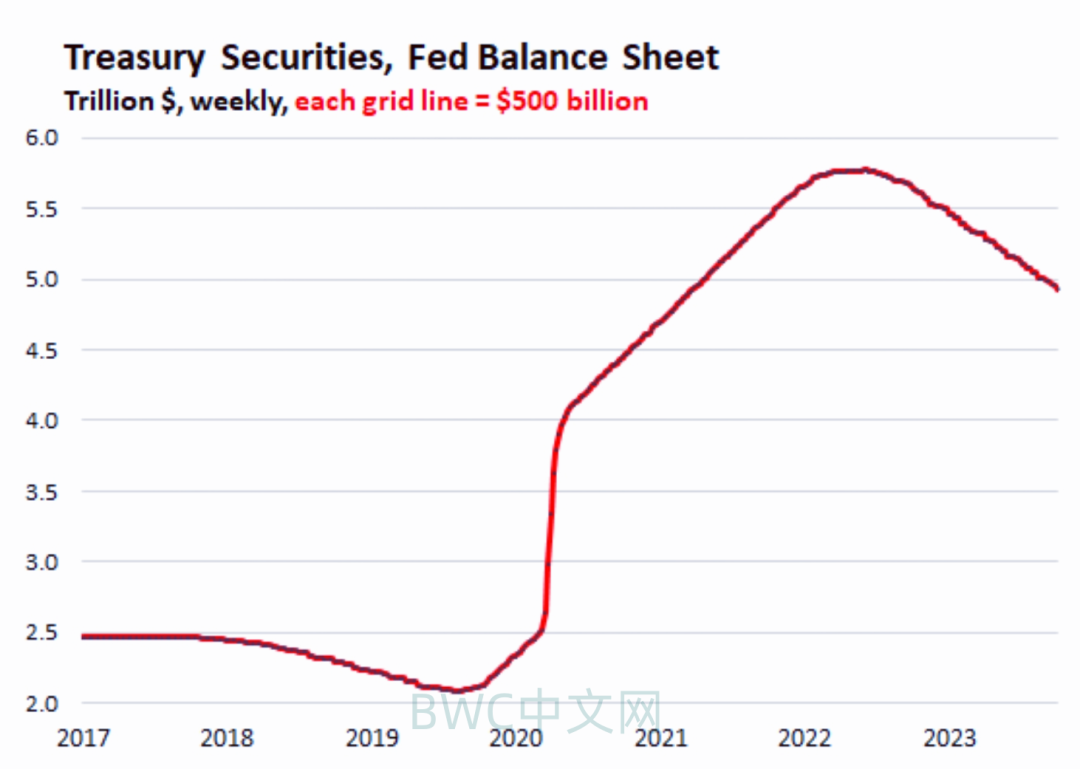 而根据下图,可以清晰地看到,美联储已通知美国财长耶伦,美联储目前持有的美债规模较2022年6月的峰值已抛售8400亿美元,至4.93万亿美元,为2021年3月以来的最低水平。美联储已抛售了其在大流行量化宽松期间购买的3.27 万亿美元美国国债的 26%。