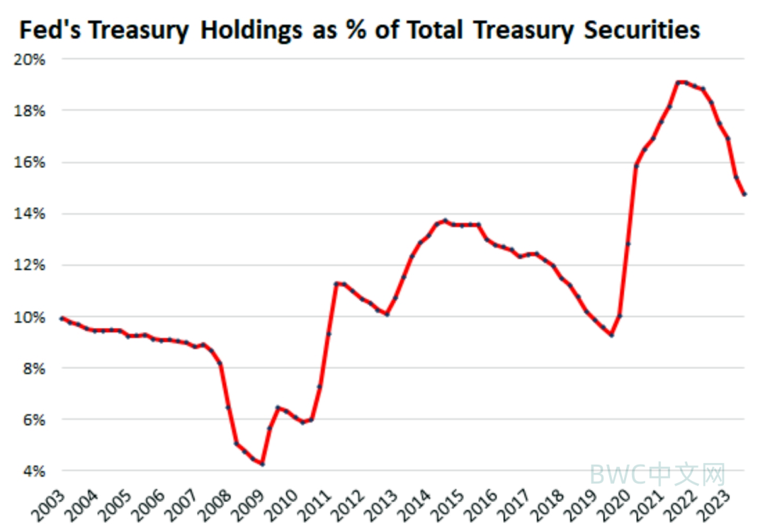 更加值得注意的是,目前,美联储持有的美国国债在美国33.7万亿美元债务总额中的占比,已降至14.6%,低于峰值时的 19.1%。这再次说明,美联储在其QT缩表进程中,美国国债真正的最大做空者和收割者正在浮出水面。