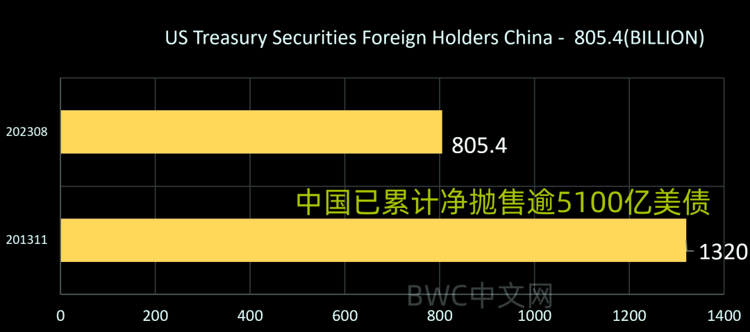 而通过上图,可以看到,中国持有美债规模已经由2013年的约1.32万亿美元峰值,累计净抛售了约5150亿美元,目前仅持仓刚刚超8000亿美元的规模。(完)