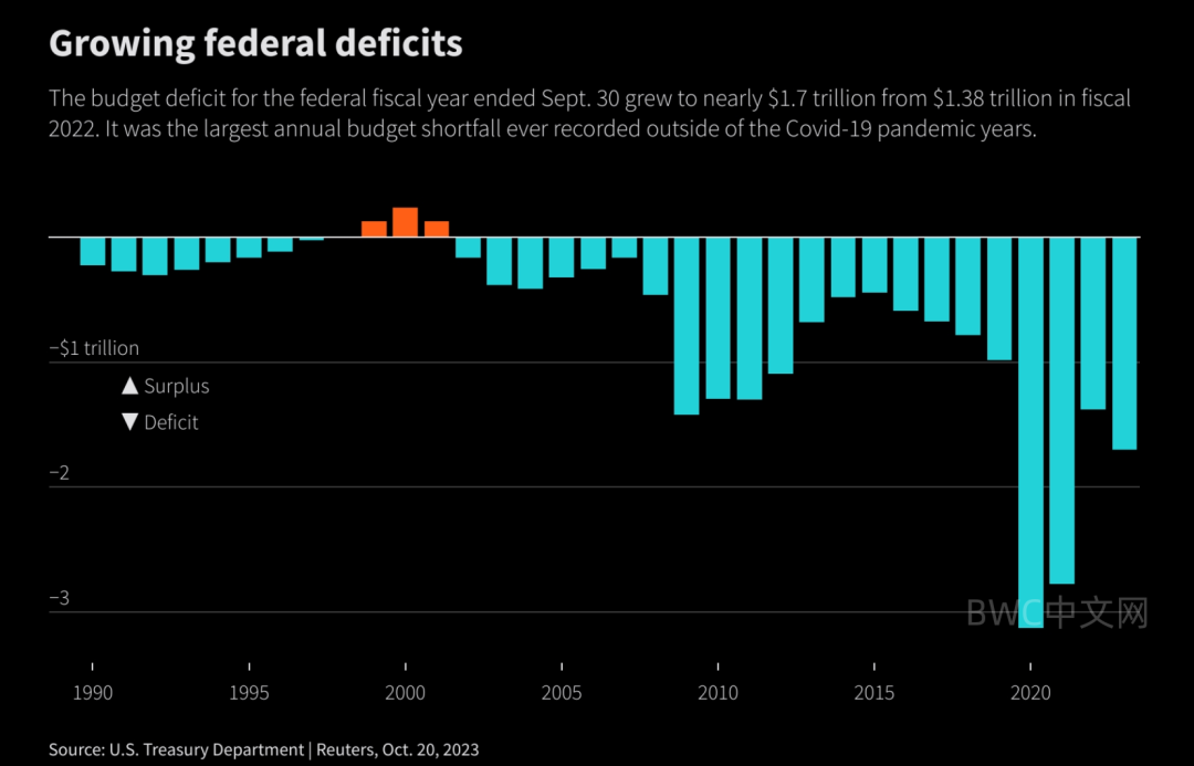 而根据美国银行10月25日发布的最新报告显示,随着利率攀升加剧美国赤字,2024年美国国债发行量可能会创下历史新高。鉴于2023财年美国的赤字超出预期,较上年增长23%,联邦债务的利息成本创历史新高,预计2024年至2026年,美国的赤字将从1.8万亿美元稳步攀升至2万亿美元。净利息支出占GDP的比重将越来越高,到2026年将攀升至创纪录的3.5%。