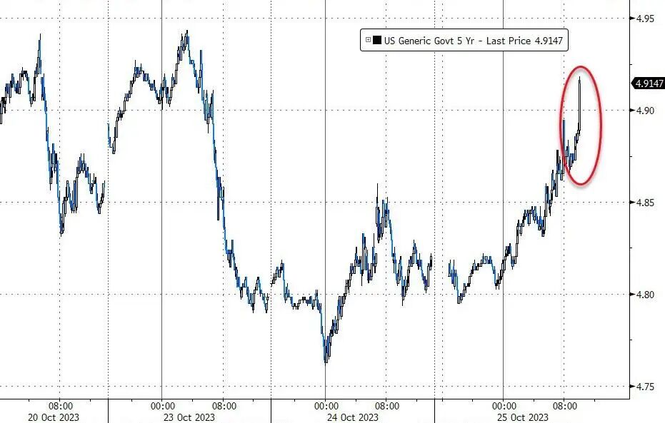 10月26日,鉴于美债收益率维持上行以及巴以冲突持续,美国长债价格暴跌,美国10年期基准国债收益率上涨11.49个基点至4.9378%,反馈短期利率前景的两年期美债收益率飙升至5.1185%,30年期美债收益率也重上5%,被投资者远离,猛烈抛售。