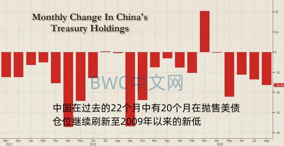 其中,8月,中国继续大幅减持164亿美元的美债至8054亿美元,仓位继续刷新至2009年以来的新低,且为连续第五个月抛售美债,数据显示,中国在过去的22个月中有20个月在抛售美债。
