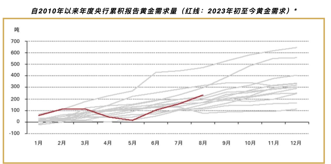 值得一提的是,自9月1日以来,十年期美债收益率从9月初的4.088%升至10月底的5.001%,触及16年以来的新高,所以,我们料将会在接下去两个月的美国财政部报告中会看到全球央行更多的美债抛售的数据,这与他们在过去的24个月内,以55年以来最快速度购买黄金的趋势形成了鲜明的对比。
