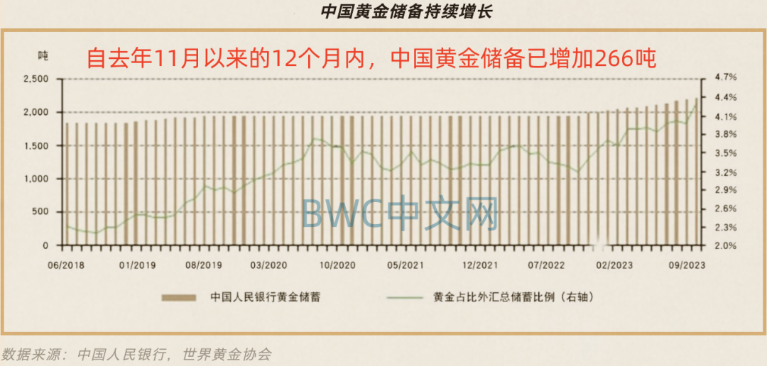 另据央行最新数据,10月,中国央行连续第12个月购入黄金,使黄金储备增加23吨,总储备量达到2,215吨。至此,黄金在中国外汇储备总额中所占的比例已高达4.3%,创下历史新高。