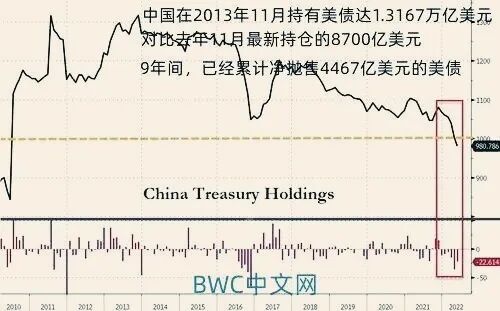 而美国财政部1月下旬公布的最新一期国际资本流动报告显示(美债数据延后两个月惯例),在截至2022年11月的12个月间,美债的第一大持有国日本已经累计净抛售了规模高达2464亿美元的美国国债,累计净抛售美债比例高达近23%,持仓降至1.0822万亿美元低点。而美债的第二大持有国中国去年11月的美债持仓则已降至8700亿美元,相比于2013年11月当时持有美债总额达1.3167万亿美元,9年间,中国已经累计净抛售了规模高达4467亿美元的美国国债。累计净抛售比例约34%。