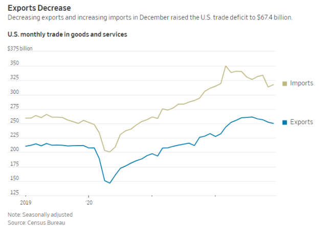 美国的许多商品价格依然高企的同时,美国人口普查局和美国经济分析局2月7日发布的最新数据显示,经修正后,美国2022年12月贸易逆差较前一个月增加约10.5%,达到674亿美元。2022年美国商品和服务贸易逆差上升至9481亿美元,为有记录以来最大逆差。过去数月,美国消费者呈现出持续排队囤积亚洲商品货物的状态。由于美国继续严重依赖从亚洲等市场进口大量商品,就导致美国赤字将随之蹿升,特别是在债务上限陷入僵局的情况下,美国的债务赤字通胀则陷入深度的恶性循环。
