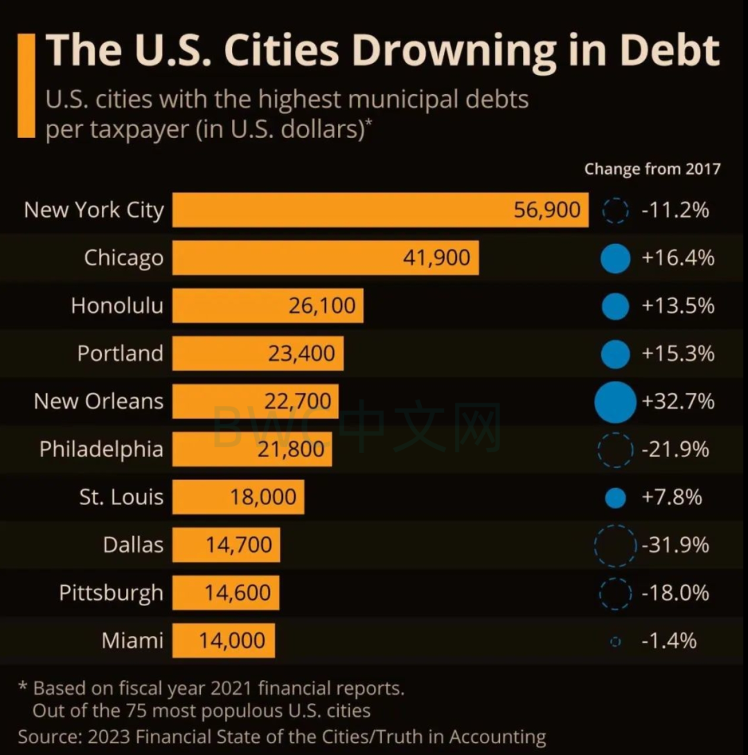 与此同时,美国越来越多的州因深陷债务困境,一些富人不愿意为此背负高昂的平均负债,而选择从这些州逃离。例如自3月硅谷银行倒闭,诱发美国银行业危机以来,伊利诺伊州最大的城市芝加哥已经有数千位百万富翁从美国撤离。而此时,无论是大多数美国中产,以及美国多个州陷入的债务困境等现象,都是美国经济长期过度依赖债务和印钞所付出的代价。