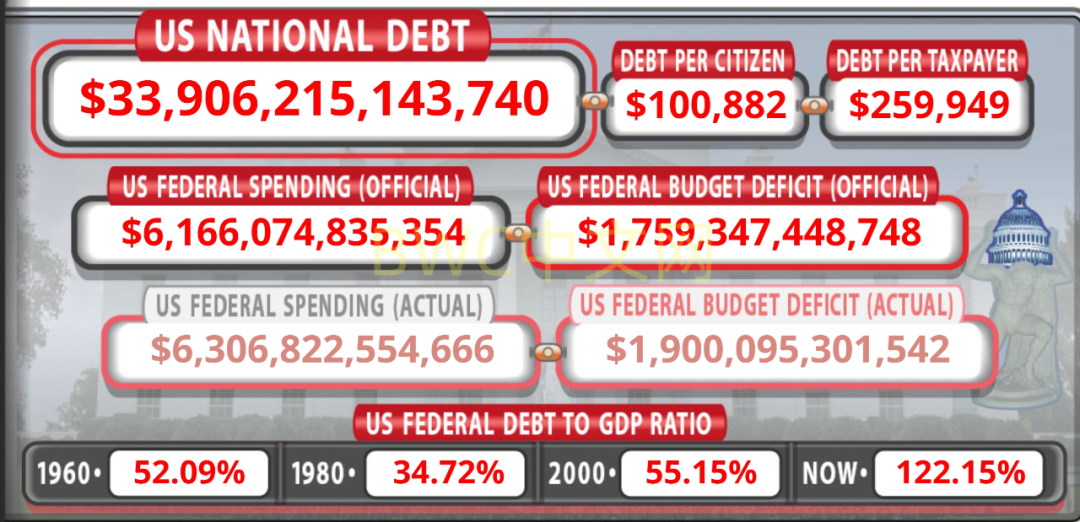 截至12月11日,美国联邦债务总额正式突破33.9万亿美元,距离34万亿美元大关仅有一步之遥。为美国GDP的122%。平均每个美国人为此背负超10万美元债务,每个美国纳税人为此背负近26万美元债务。这个每秒钟都在增加的美国国债时钟时刻提醒着每个美国人,美国经济多年以来取得的一系列财富和美国人的社会福利保障都是建立在面向全球借债而实现的。因此,如果美国国债的全球流动性枯竭,美国债务危机就迫在眉睫。正如美国财长耶伦多次警告,如果不能继续借新还旧,美国将陷入前所未有的经济和金融灾难。