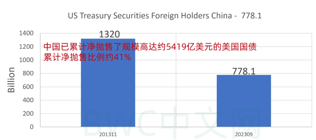 值得一提的是,中国在2019年之前的很长一段时间,一直都是美债的第一大持有国。但目前虽然持仓规模是仅次于日本的美债的第二大持有国,持美债总量却已跌至7781亿美元的美国金融危机以来的低水平区位。并且相比于2013年11月持有美债总额约1.32万亿美元,近十年间,中国已累计净抛售了5419亿美元的美国国债,累计净抛售比例约41%。成为美债最大国际卖家。