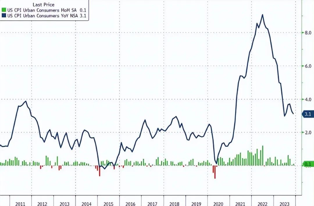 然而就在12月12日当天,美国劳工统计局公布的数据显示,美国11月CPI同比上涨3.1%,较10月的3.2%放缓,符合预期;核心CPI同比增速4%,与10月持平。但需要注意的是,CPI环比增速升至0.1%,高于前值和预期的0%。