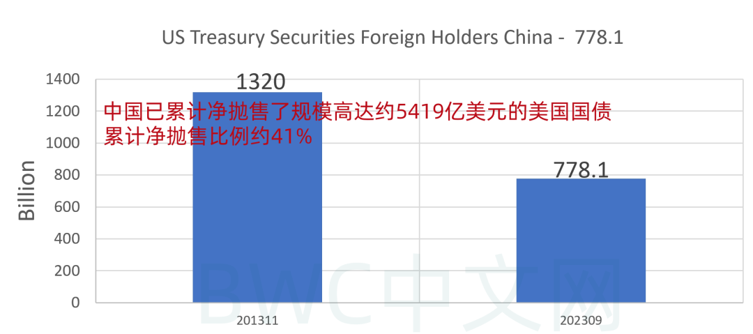 因为在2019年之前的很长一段时间,中国一直是美债持仓高于日本的美债第一大持有国。不过,此后,美债持仓呈现一路走低的状态。目前仅持有7781亿美元,较2013年一度高达1.32万亿美元峰值,中国已累计净抛售了规模高达5419亿美元的美国国债,这一净抛售规模仅次于美债第三大持有国英国持有的美债总量。