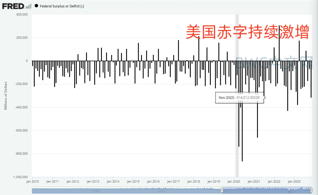 这与美国联邦激增的债务利息成本如出一辙,2023财年美国联邦的预算赤字为 1.7 万亿美元,为仅次于2020和2021大流行两年的史上第三大赤字额。专家预计,如果不进行立法改革,未来十年美国联邦赤字规模将保持在每年接近 2 万亿美元,美国正在进入2万亿美元年赤字的时代,这无形也给到了美联储利率方面的巨大决策压力。因为利率水平直接关系到美国联邦的财政支出和是否会延续入不敷出的景象。