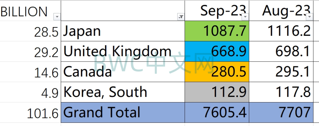 而美债的第三大持有国英国9月抛售了292亿美元的美国国债,成为当月美债最大的国际做空者。英国当月减持比例超过4%。与之相似的是,加拿大9月减持146亿美元的美国国债,当月减比近5%。同时韩国也在9月减持了49亿美元的美国国债。