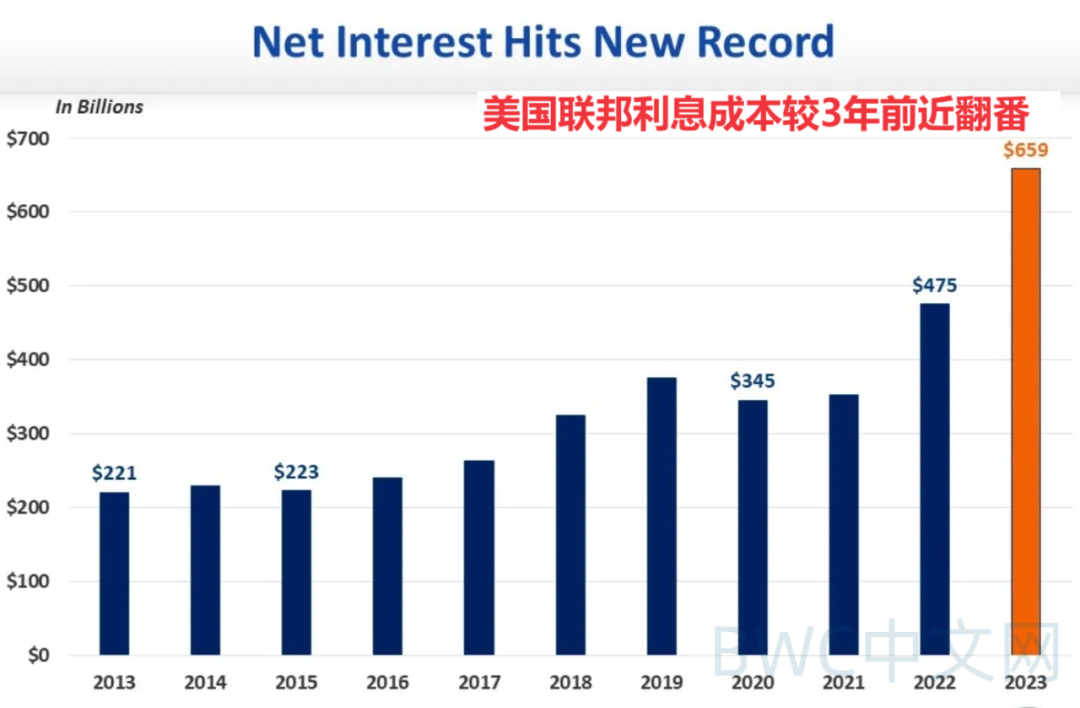而10月和11月两个月联邦债务利息则比去年同期高出663亿美元。并且截至9月末的2023财年,美国联邦净利息成本达到6590亿美元,三年内几乎翻了一番。分析认为,不断激增的联邦债务利息成本似乎正在压垮美国债务经济模式。