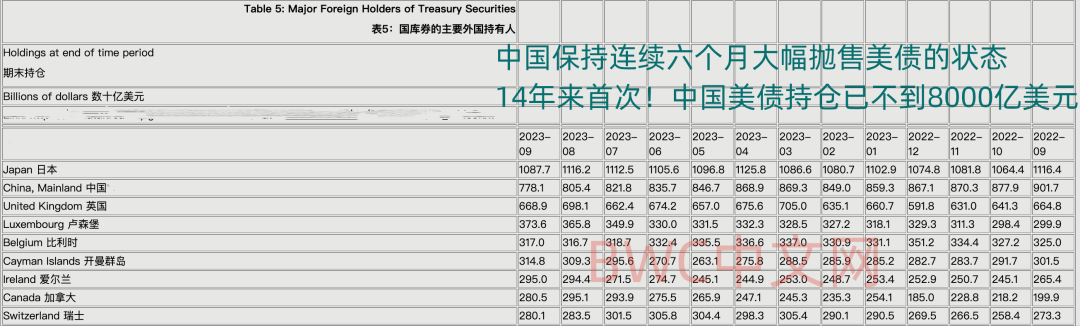 我们发现,中国在过去的23个月内,有21个月呈现抛售美债的状态,特别是进入2023年以来,中国抛售美债的速度正在加快,这表明,中国正式拉开了新一轮大幅度抛售美债的浪潮。目前,中国仍为美债的第二大海外持有者。