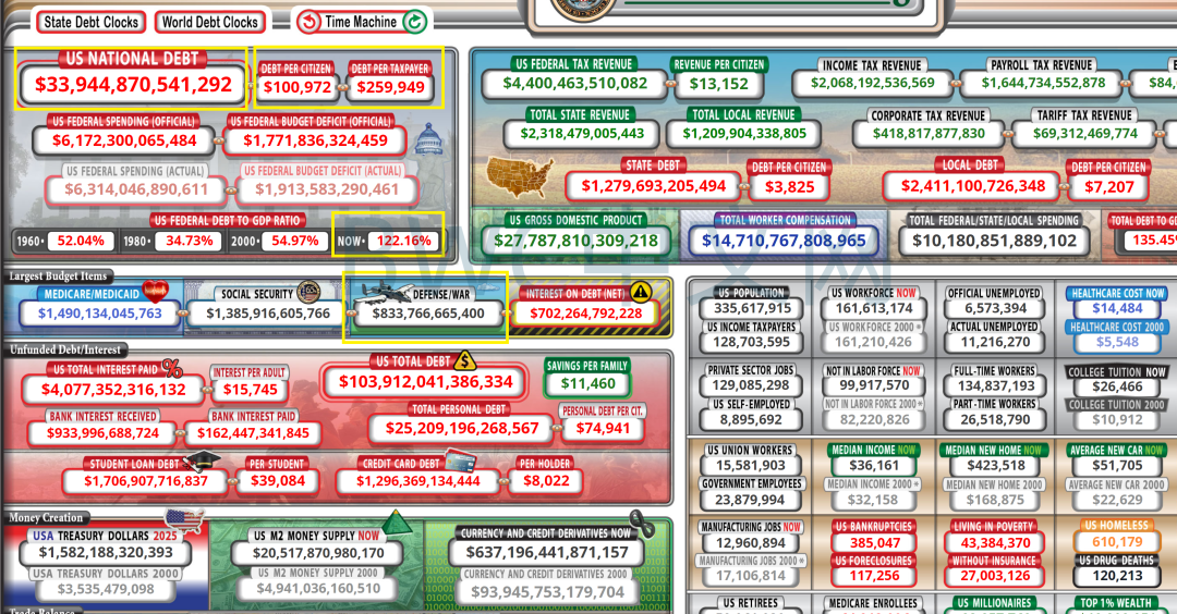 截至12月25日,美国联邦债务总额高达33.94万亿美元,是美国GDP的122%。作为全球迄今为止最大的债务国,包括老人,儿童在内的平均每个美国人要为此背负超10万美元债务,平均每个美国纳税人则为此背负26万美元债务。而前面提及的国防预算所需要的资金,所产生的债务,以及美国纳税人为此间接承担的支出,正是上述债务总额的一个部分。