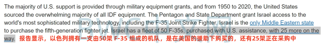 从1950年到2020 年,以色列国防军绝大多数装备都是美国采购的。其中,以色列拥有一支由50架 F-35 组成的机队,是在美国的援助下购买的,还有25架正在采购中。分析认为,该报告进一步揭开了,美国经济表面以保护盟友安全为由,实则是为自己获取利润的真相。