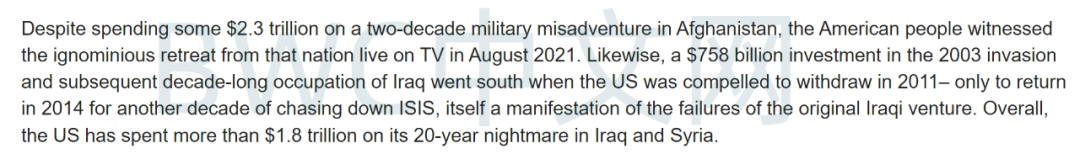例如,尽管在阿富汗花费了约 2.3万亿美元,上演了长达20年的风波,但美国人还是在2021 年8月通过电视直播亲眼目睹了从该国的撤退。同样,在2003年入侵和随后长达10年的伊拉克进攻中,美国投资了7,580 亿美元,2011年被迫撤军。与此同时,过去20年间,美国在伊拉克和叙利亚的战略投资总共花费了超过1.8万亿美元。