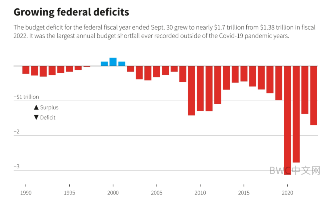 如下图,2020年至2023年,美国联邦的预算赤字几乎占据了美国经济史上前四大赤字年份。专家预计,美国正在进入2万亿美元年赤字的时代。2023年以来,白宫至少上演了三次因债务上限问题而面临的潜在关门停摆危机。