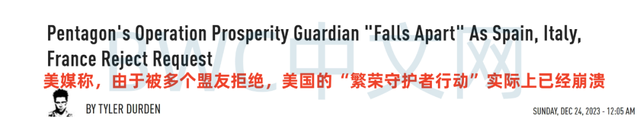 美国金融分析机构零对冲分析称,由于被多个盟友拒绝,美国的“繁荣守护者行动”实际上已经崩溃。美国不但失去了在中东地区的影响力,还在失去盟友们的信任,这也是美国经济及美元货币地位下降的体现。