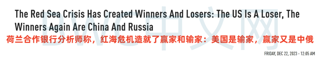 比如,法国道达尔能源公司数周前就完成了一笔以人民币计价的液化天然气交易。法国总统马克龙也在2023年4月就表示,欧洲必须减少对美国的依赖,“顶住压力,不做美国的追随者。”他同时呼吁欧洲减少对“美元治外法权”的依赖。分析认为,这也是法国等至少5个盟友拒绝美国“繁荣卫士行动”的原因之一。正如美媒12月22日援引荷兰合作银行的分析师本杰明·皮克顿称,红海危机造就了赢家和输家:美国是输家,赢家又是中俄。