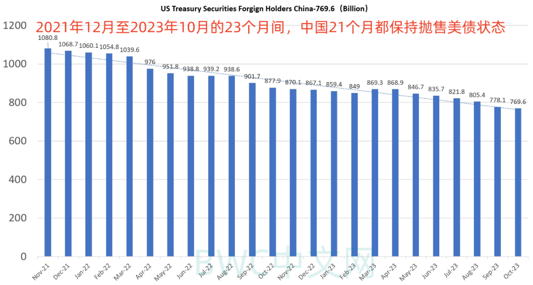 值得一提的是,就在美联储启动新一轮降息周期之前,作为美债第二大持有国,中国也已经提前进入美债抛售周期,自2021年12月至2023年10月的23个月间,中国21个月都保持抛售美债状态。持仓由当时的1.09万亿美元降至7696亿美元的历史低点,累计净抛售约3204亿美元的美国国债。