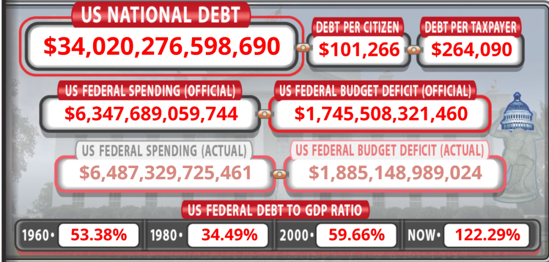 而截至1月9日,如下这张每秒钟都在增加的美国国债时钟时刻提醒着每个美国人,今天美国的国家负债总额已高达超34万亿美元,是人类历史上背景债务最高的国家。美国经济的一系列财富都是建立在面向全球举债而现的。