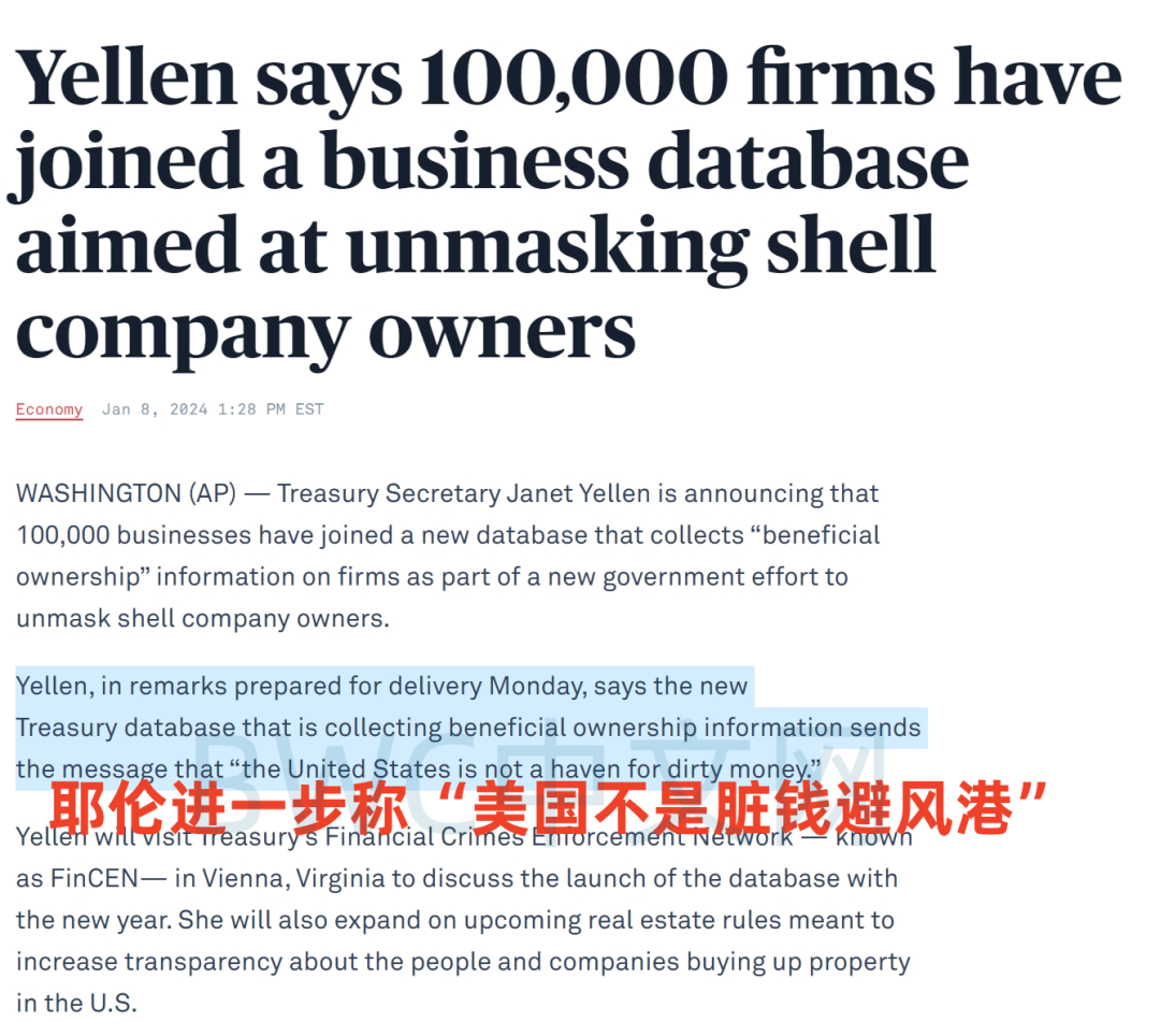耶伦讲话中表示,正在收集实益所有权信息的新财政部数据库发出的信号是“美国不是脏钱的避风港”。