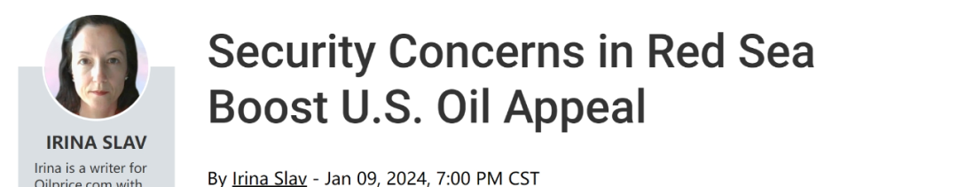 对此,能源分析师伊琳娜·斯拉夫(Irina Slav)1月9日称,红海安全担忧,增强了美国石油的吸引力。全球最大的石油咽喉要道之一,位于红海南端也门和吉布提之间,连接红海和亚丁湾的曼德海峡安全问题日益严重,这导致市场客户对美国石油的需求增加,尤其是来自欧洲市场,因为贸易商寻求更安全、更具成本效益的来源。