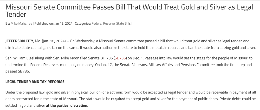 而这也就解释了为什么最近一段时间以来,还包括新罕布什尔州、新泽西州、加利福尼亚州,佛罗里达州、明尼苏达州,缅因州和佛蒙特州也开始宣布黄金为法定货币的部分原因了。