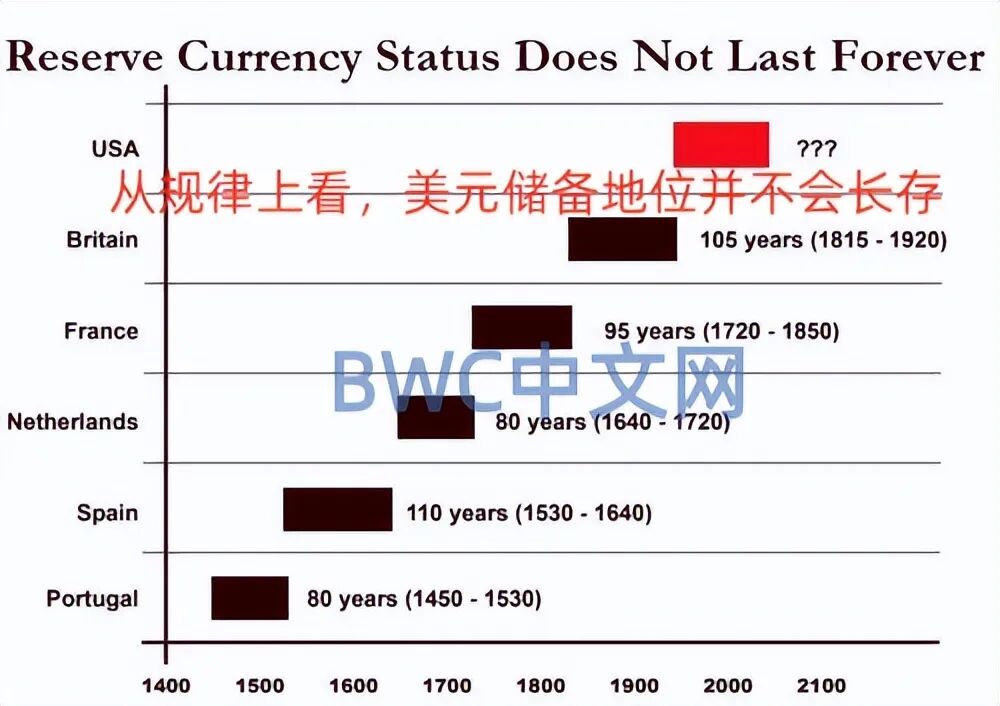而下面这张图表则进一步说明,过去600多年间,全球货币的变迁都是跟随经贸而动的。因为商品交易越广泛,其主体的货币被使用的概率就应该越高,这也是对每一个经贸参与者都便利的事。