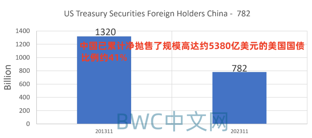 值得一提的是,根据美国财政部的历史报告,美债第二大持有国中国在2013年11月持有美债高达约1.32万亿美元,而目前的持仓为7820亿美元,相当于10年间,中国已累计净抛售了规模高达约5380亿美元的美国国债,累计净抛售比例高达41%。