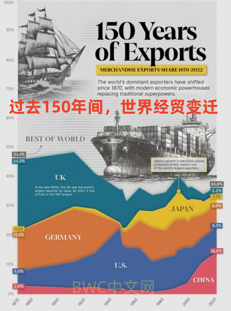 如下图,过去150年来世界经贸格局的变迁趋势表明,19世纪,英国主导了全球的商品出口,因此英镑也成为很长一段时间世界储备货币的主角。而二战后,美国取代英国和德国,成为最大出口国。自此,已经通过一战渐渐取代英镑的美元也在上世纪40年代中叶的布雷顿森林体系中,通过与黄金挂钩,拥有了美金的身份,并且彻底取代英镑成为全球货币之王。