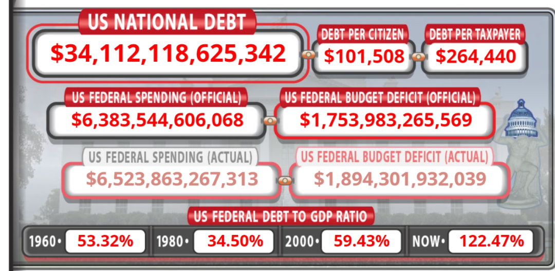 自1980年以来,美国国债规模从接近1万亿美元增至34万亿美元。特别是过去4年就增加了11万亿美元,是美国近248年历史上债务总额的三分之一。而过去2年增加的数字是4万亿美元,过去6个月为2万亿美元,过去3个月约1万亿美元...