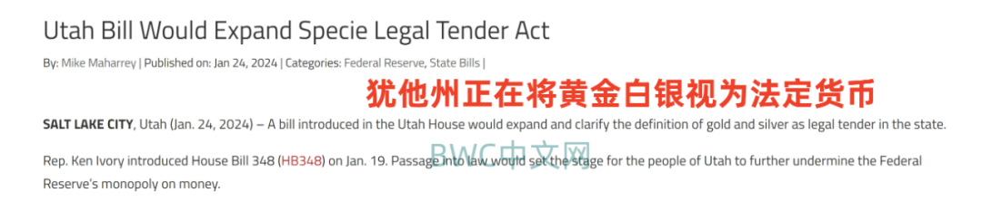 比如,事情的一个新进展是,犹他州众议院已在1月24日提出一项法案,将扩大并澄清黄金和白银作为该州法定货币的定义,以和美联储的货币体系分庭抗礼。
