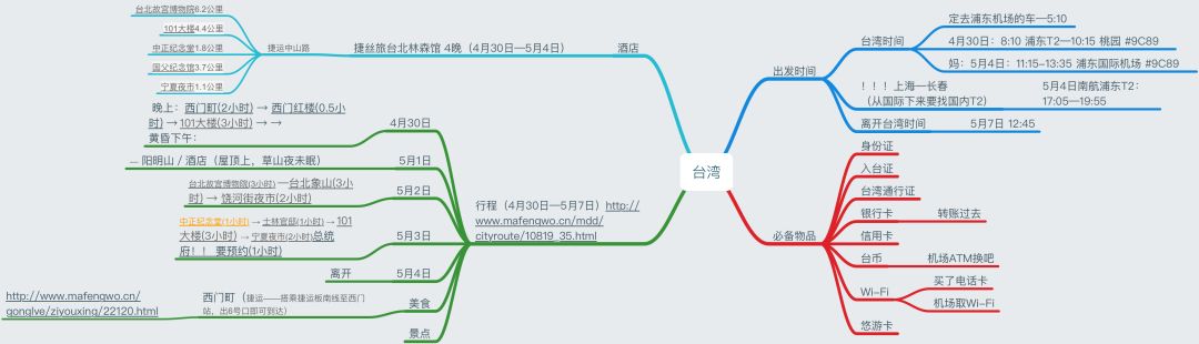 出境要准备的东西略多,我和妈妈要异地出发,定时间,订机票,酒店,电话卡,现金,路线时间表等,尤其第一次出境,有些抓狂和烦躁。读了一些台湾的游记,利用思维导图整理了下,把基本的东西整理好,能清楚的知道自己的进展,避免遗漏。