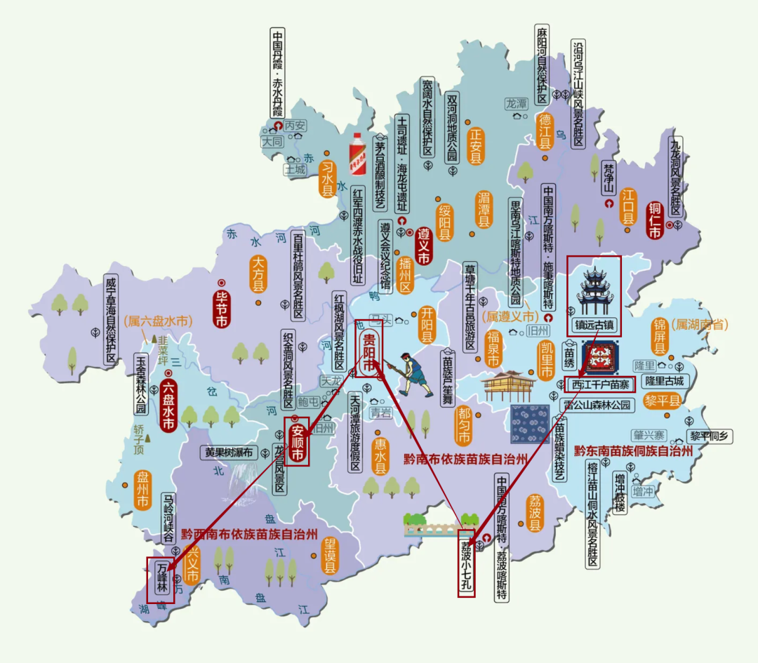 10天行程:镇远古镇--西江千户苗寨--荔波大小七孔(2天)--贵阳市(2天)--安顺黄果树瀑布(2天)--兴义万峰林(2天)。(如下图)