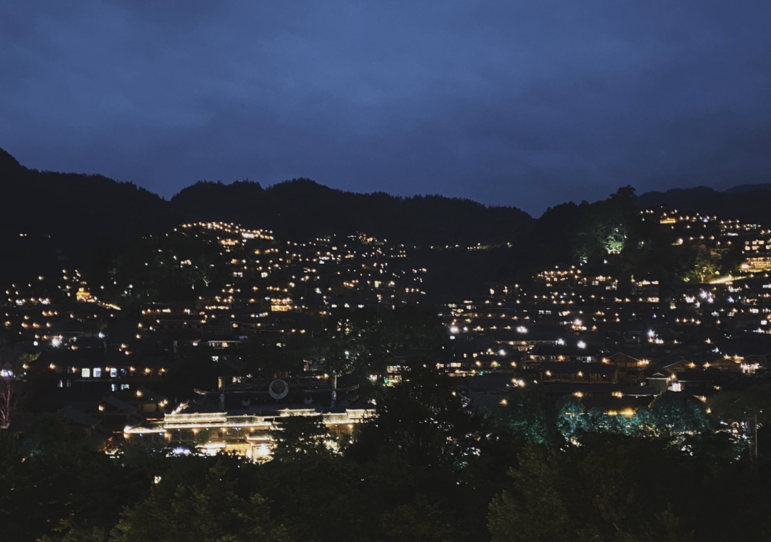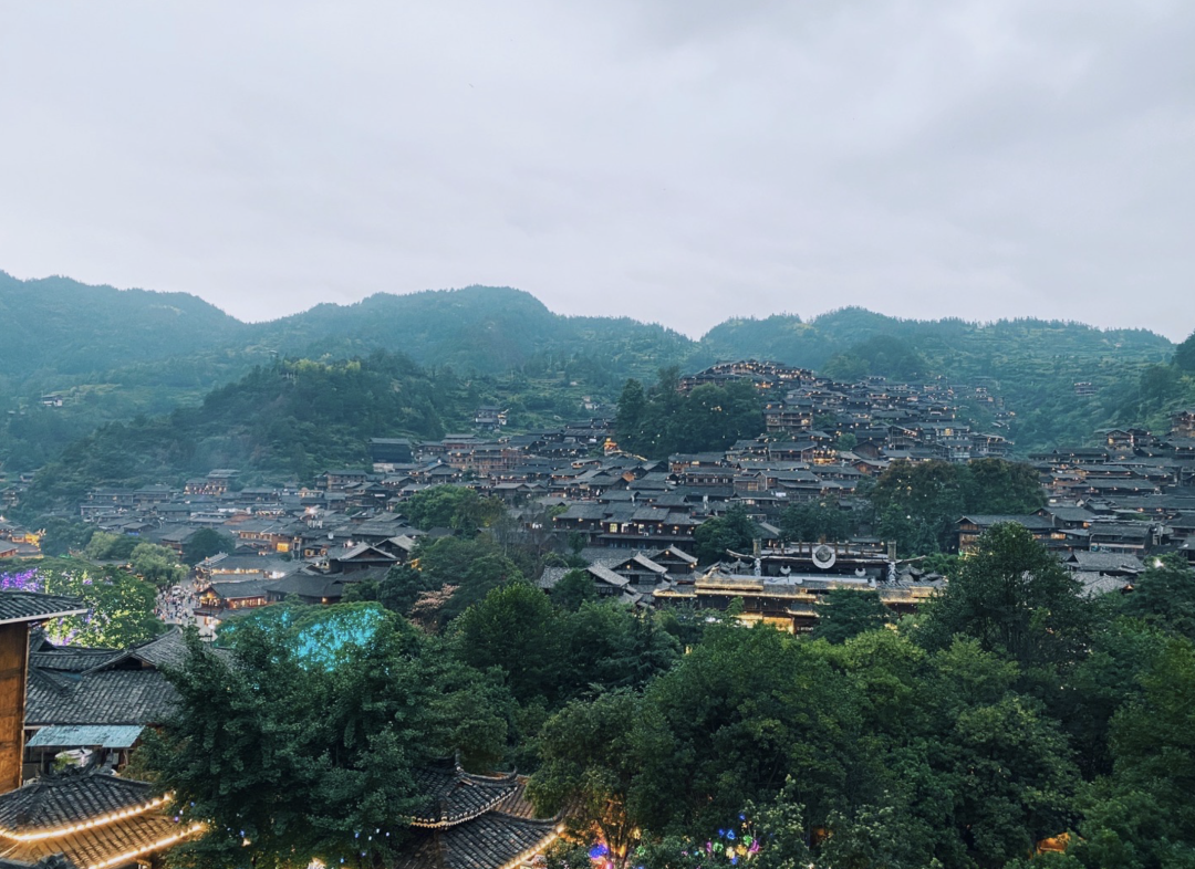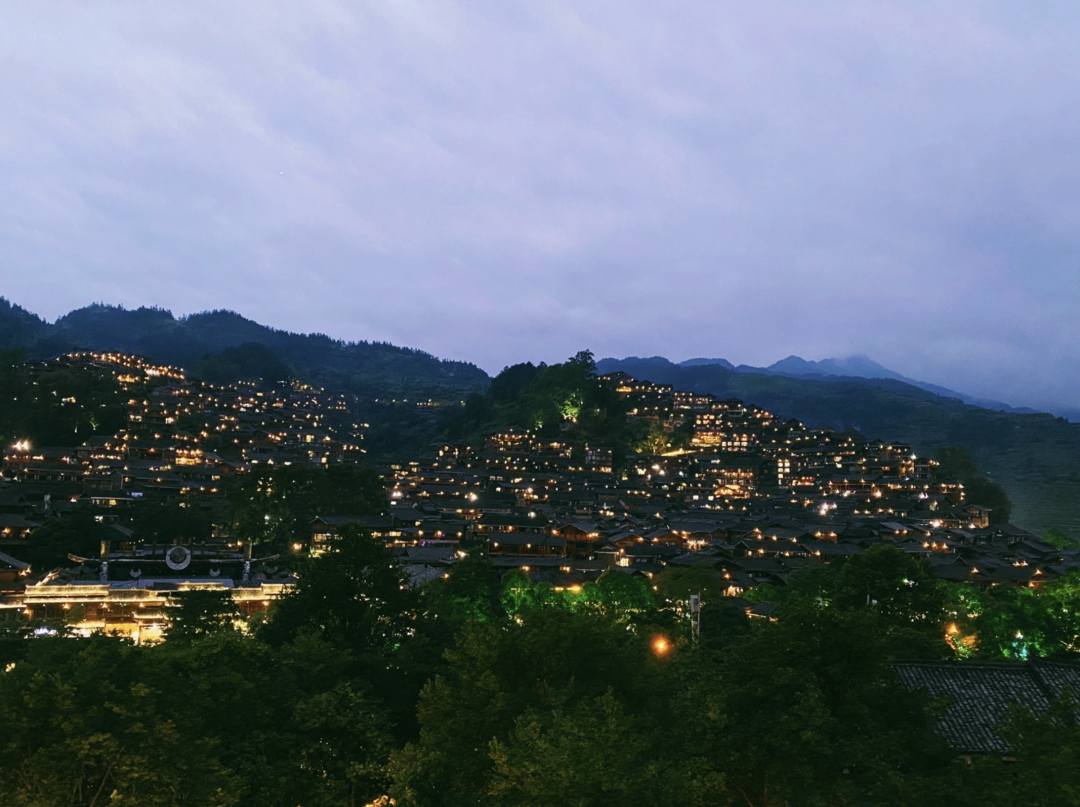 不过苗寨值得住上一晚,夜幕逐渐降临,天色一点点由蓝色变成深蓝,远处还有一点点夕阳的影子,一丝丝金黄色,山里面亮起来星星点点,山脚下也热闹起来,开始唱K,太吵了倒是真的。
