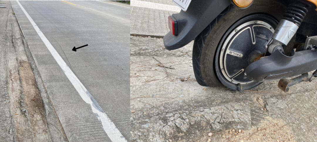 这都不是最刺激的,最惊险的是在我骑行了60多公里,在一个下坡我突然爆胎了……车把不受控制,真的是靠刹车硬停了下来。所幸都没受伤,停稳车我人都懵的,完全不清楚发生了啥,下车往回看,还能看见清晰的刹车痕迹……