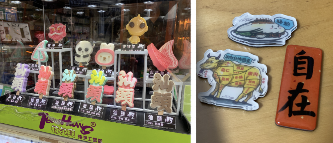 2)文创商品密度高且讨喜。文创雪糕不是新鲜玩意,但这边售卖密度极高,在别的城市我遇到的也就是几家卖这个而已。我还发现一个新华书店,万万没想到,巨丰富的冰箱贴,而且很契合地方特色,比如肠粉、牛肉标记好每一个牛肉的位置,上一次让我印象深刻的还是景德镇。