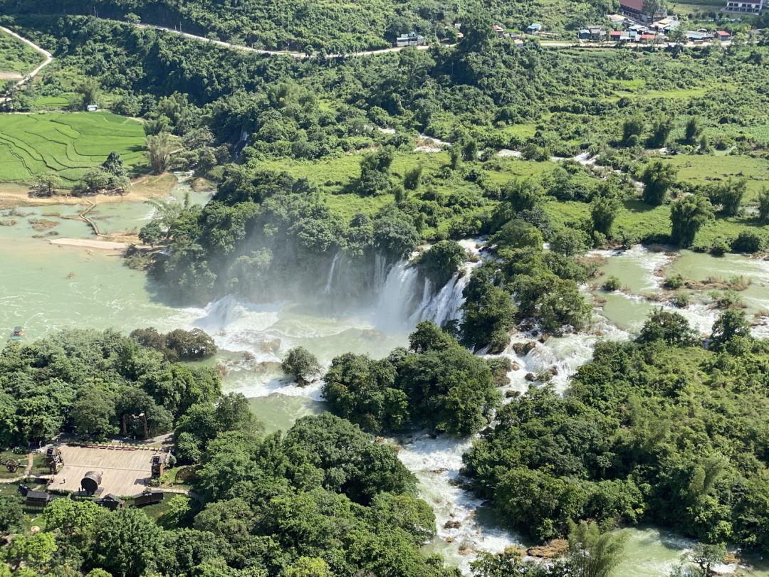 怎么叫跨国大瀑布,看下图,左侧是属于越南,他们叫板约瀑布,右侧属于中国。但其实越南的竹筏也可以划到这。