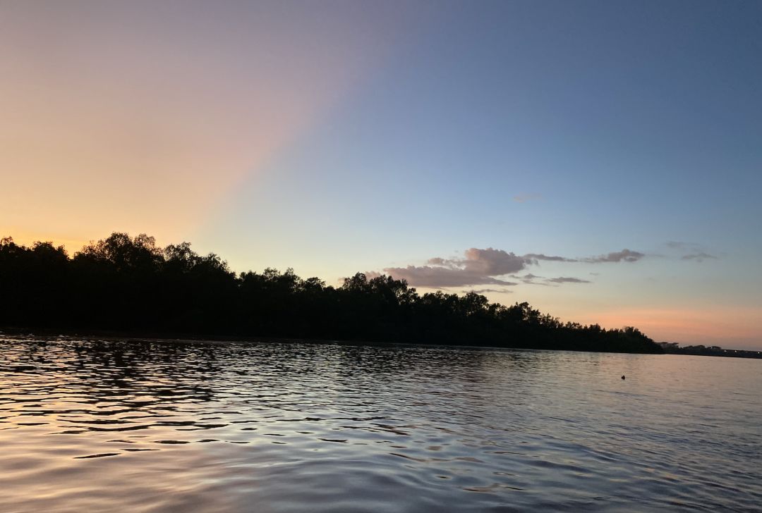 去看萤火虫的路上,天空橙色和蓝色分明,很美