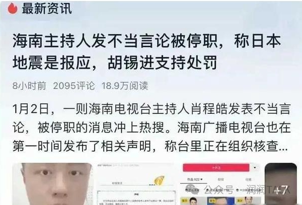 2024年伊始,日本地震牵动着全球的心。然而,一名海南台主持人肖程皓的一句话引起了意想不到的风波。在个人社交平台上发布的视频中,肖程皓说出了“报应来了?”这样的话。作为海南台的主持人,他的发声不仅引起粉丝关注,也在社交媒体上掀起了争议的风潮。