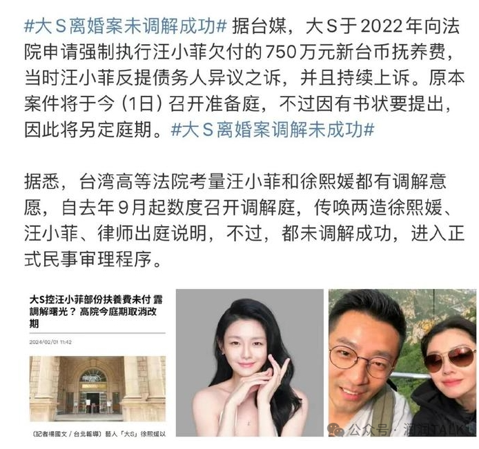 近期,大S的离婚协议曝光,其中涉及到抚养费的问题。汪小菲被指未履行离婚协议,拖欠抚养费750万元,导致大S向法院申请强制执行。这一纠纷令两人的感情纠葛再度引发关注。大S通过法律手段寻求强制执行抚养费750万元,而高等法院对此进行了裁决。汪小菲虽然提起了异议之诉,但目前尚未有明确的结果。这场法律斗争不仅牵扯到金钱,更反映了两人之间感情的复杂和深刻。