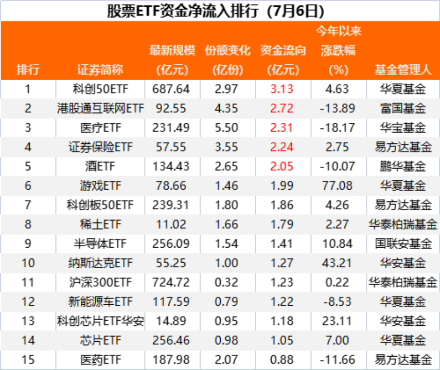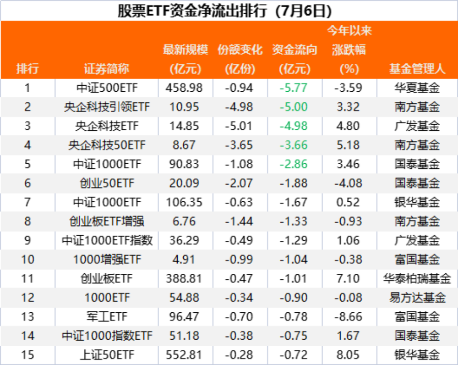 7月6日,A股延续缩量下跌态势。当日全市场股票ETF基金份额有所增加,却难挡资金净流出态势。由于部分成交均价较高的股票ETF遭遇较多净赎回,近5亿资金借道ETF出逃。